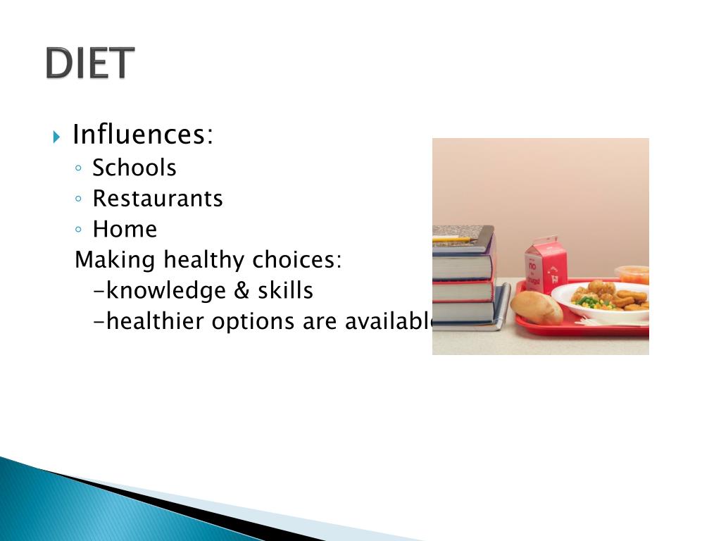 DIET • Influences: • Schools • Restaurants • Home Making healthy choices: -knowledge & skills -healthier options are available