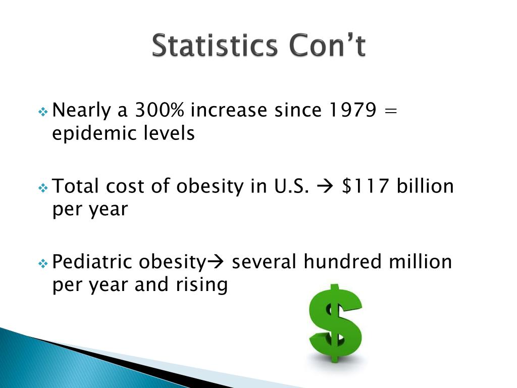 Statistics Con’t • Nearly a 300% increase since 1979 = epidemic levels • Total cost of obesity in U.S. $117 billion per year • Pediatric obesity several hundred million per year and rising
