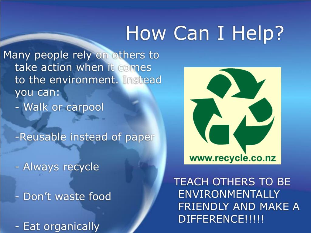 Many people rely on others to take action when it comes to the environment. Instead you can: - Walk or carpool -Reusable instead of paper - Always recycle - Don’t waste food - Eat organically TEACH OTHERS TO BE ENVIRONMENTALLY FRIENDLY AND MAKE A DIFFERENCE!!!!! How Can I Help?