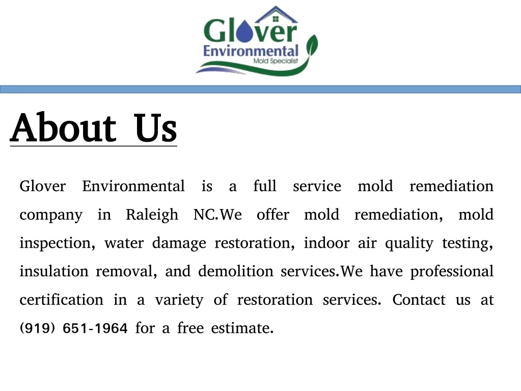 About Us Glover Environmental is a full service mold remediation company in Raleigh NC.We offer mold remediation, mold inspection, water damage restoration, indoor air quality testing, insulation removal, and demolition services.We have professional certification in a variety of restoration services. Contact us at (919) 651-1964 for a free estimate.