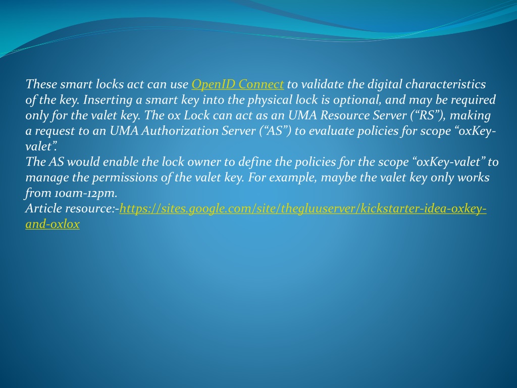 These smart locks act can use OpenID Connect to validate the digital characteristics of the key. Inserting a smart key into the physical lock is optional, and may be required only for the valet key. The ox Lock can act as an UMA Resource Server (“RS”), making a request to an UMA Authorization Server (“AS”) to evaluate policies for scope “oxKey-valet”. The AS would enable the lock owner to define the policies for the scope “oxKey-valet” to manage the permissions of the valet key. For example, maybe the valet key only works from 10am-12pm. Article resource:-https://sites.google.com/site/thegluuserver/kickstarter-idea-oxkey-and-oxlox