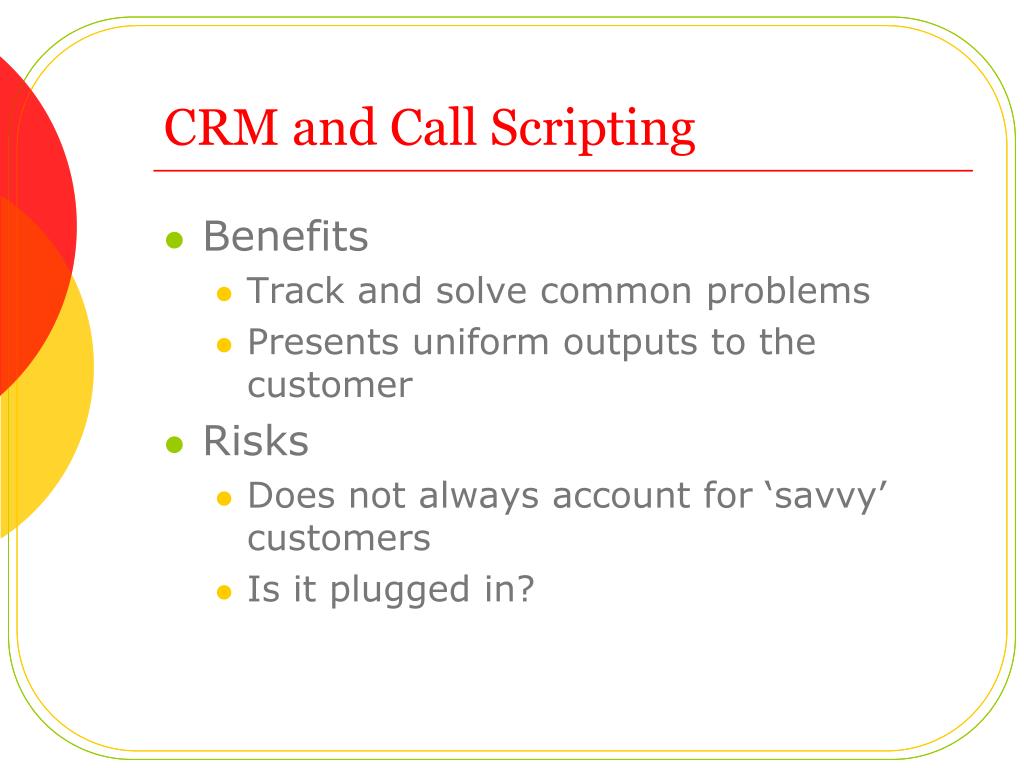 CRM and Call Scripting • Benefits • Track and solve common problems • Presents uniform outputs to the customer • Risks • Does not always account for ‘savvy’ customers • Is it plugged in?