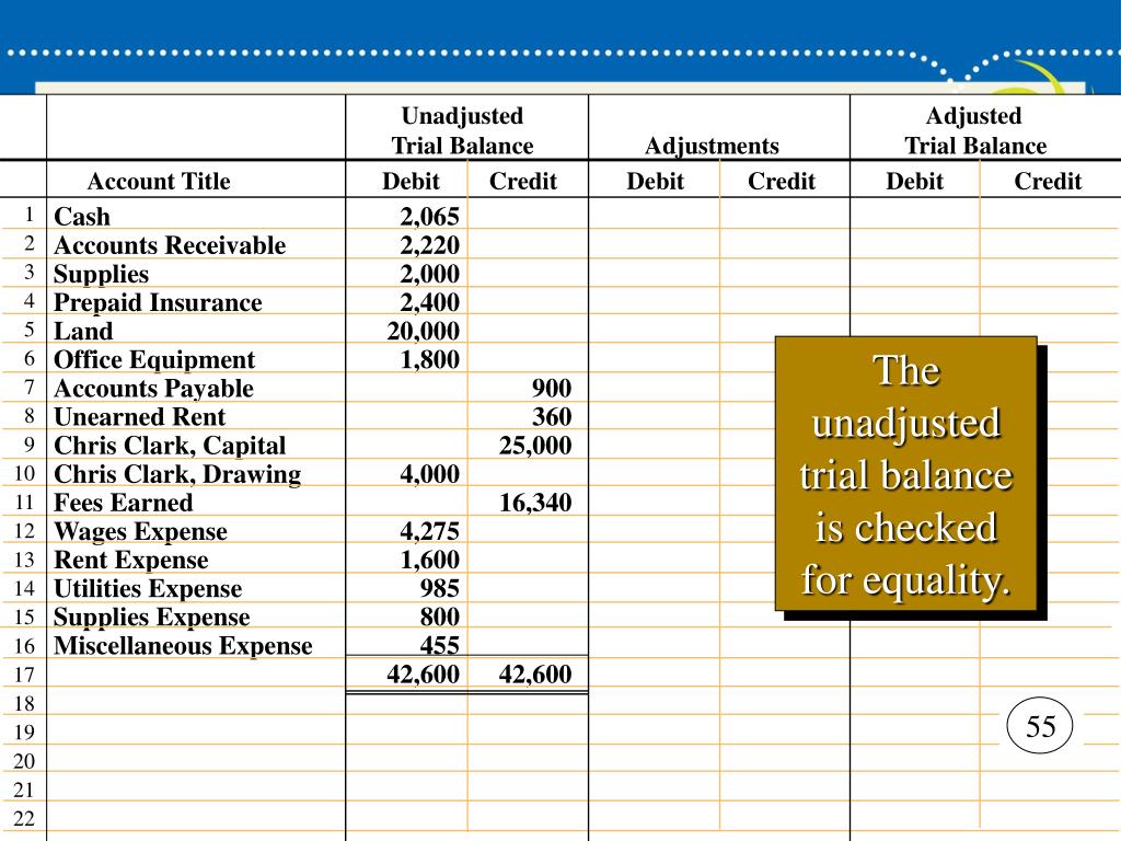 0 Unadjusted Adjusted Trial Balance Adjustments Trial Balance Account Title Debit Credit Debit Credit Debit Credit 1 2 3 4 5 6 7 8 9 10 11 12 13 14 15 16 17 18 19 20 21 22 Cash 2,065 Accounts Receivable 2,220 Supplies 2,000 Prepaid Insurance 2,400 Land 20,000 Office Equipment 1,800 Accounts Payable 900 Unearned Rent 360 Chris Clark, Capital 25,000 Chris Clark, Drawing 4,000 Fees Earned 16,340 Wages Expense 4,275 Rent Expense 1,600 Utilities Expense 985 Supplies Expense 800 Miscellaneous Expense 455 42,600 42,600 The unadjusted trial balance is checked for equality. 55