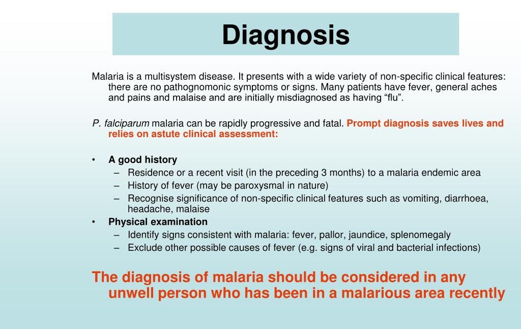 Malaria is a multisystem disease. It presents with a wide variety of non-specific clinical features: there are no pathognomonic symptoms or signs. Many patients have fever, general aches and pains and malaise and are initially misdiagnosed as having “flu”. P. falciparum malaria can be rapidly progressive and fatal. Prompt diagnosis saves lives and relies on astute clinical assessment: A good history Residence or a recent visit (in the preceding 3 months) to a malaria endemic area History of fever (may be paroxysmal in nature) Recognise significance of non-specific clinical features such as vomiting, diarrhoea, headache, malaise Physical examination Identify signs consistent with malaria:fever, pallor, jaundice, splenomegaly Exclude other possible causes of fever (e.g. signs of viral and bacterial infections) The diagnosis of malaria should be considered in any unwell person who has been in a malarious area recently Diagnosis