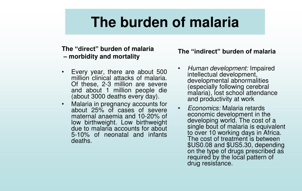 The “direct” burden of malaria – morbidity and mortality Every year, there are about 500 million clinical attacks of malaria. Of these, 2-3 million are severe and about 1 million people die (about 3000 deaths every day). Malaria in pregnancy accounts for about 25% of cases of severe maternal anaemia and 10-20% of low birthweight. Low birthweight due to malaria accounts for about 5-10% of neonatal and infants deaths. The “indirect” burden of malaria Human development: Impaired intellectual development, developmental abnormalities (especially following cerebral malaria), lost school attendance and productivity at work Economics: Malaria retards economic development in the developing world. The cost of a single bout of malaria is equivalent to over 10 working days in Africa. The cost of treatment is between $US0.08 and $US5.30, depending on the type of drugs prescribed as required by the local pattern of drug resistance. The burden of malaria