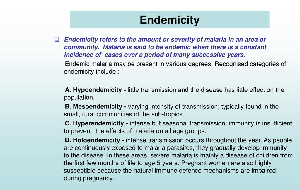 Endemicity • Endemicity refers to the amount or severity of malaria in an area or community. Malaria is said to be endemic when there is a constant incidence of cases over a period of many successive years. Endemic malaria may be present in various degrees. Recognised categories of endemicity include : A. Hypoendemicity - little transmission and the disease has little effect on the population. B. Mesoendemicity - varying intensity of transmission; typically found in the small, rural communities of the sub-tropics. C. Hyperendemicity - intense but seasonal transmission; immunity is insufficient to prevent the effects of malaria on all age groups. D. Holoendemicity - intense transmission occurs throughout the year. As people are continuously exposed to malaria parasites, they gradually develop immunity to the disease. In these areas, severe malaria is mainly a disease of children from the first few months of life to age 5 years. Pregnant women are also highly susceptible because the natural immune defence mechanisms are impaired during pregnancy.