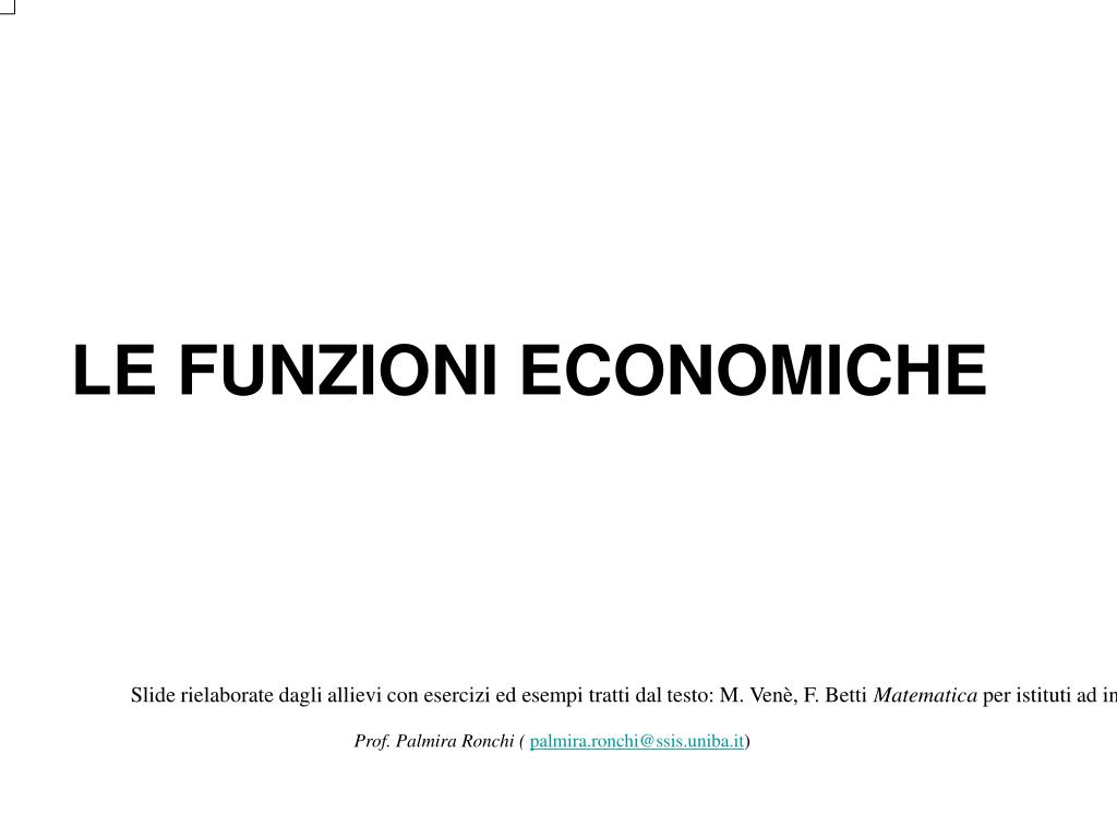 LE FUNZIONI ECONOMICHE • Slide rielaborate dagli allievi con esercizi ed esempi tratti dal testo: M. Venè, F. Betti Matematica per istituti ad indirizzo economico commerciale, Classe quarta Milano Sansoni 2002 • Prof. Palmira Ronchi ( palmira.ronchi@ssis.uniba.it)