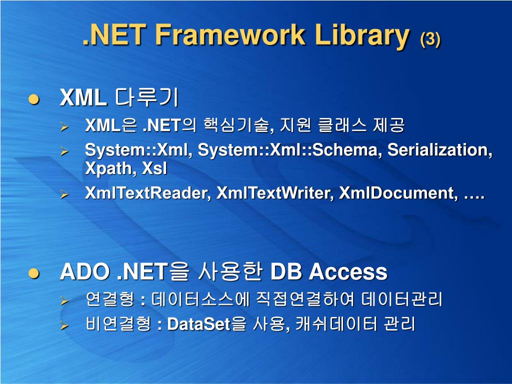 .NET Framework Library(3) • XML 다루기 • XML은 .NET의 핵심기술, 지원 클래스 제공 • System::Xml, System::Xml::Schema, Serialization, Xpath, Xsl • XmlTextReader, XmlTextWriter, XmlDocument, …. • ADO .NET을 사용한 DB Access • 연결형 : 데이터소스에 직접연결하여 데이터관리 • 비연결형 : DataSet을 사용, 캐쉬데이터 관리