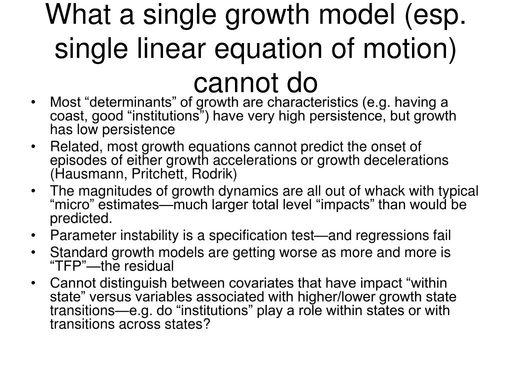 What a single growth model (esp. single linear equation of motion) cannot do • Most “determinants” of growth are characteristics (e.g. having a coast, good “institutions”) have very high persistence, but growth has low persistence • Related, most growth equations cannot predict the onset of episodes of either growth accelerations or growth decelerations (Hausmann, Pritchett, Rodrik) • The magnitudes of growth dynamics are all out of whack with typical “micro” estimates—much larger total level “impacts” than would be predicted. • Parameter instability is a specification test—and regressions fail • Standard growth models are getting worse as more and more is “TFP”—the residual • Cannot distinguish between covariates that have impact “within state” versus variables associated with higher/lower growth state transitions—e.g. do “institutions” play a role within states or with transitions across states?