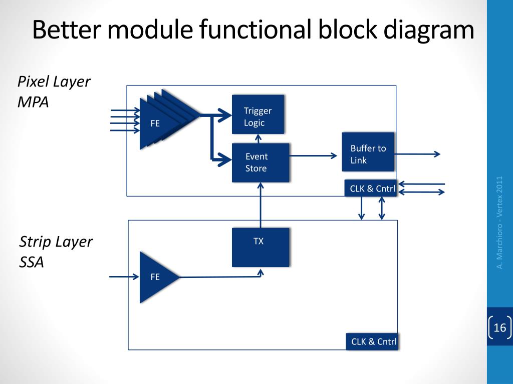 Better module functional block diagram Pixel Layer MPA Trigger Logic FE Buffer to Link Event Store CLK & Cntrl A. Marchioro - Vertex 2011 Strip Layer SSA TX FE CLK & Cntrl