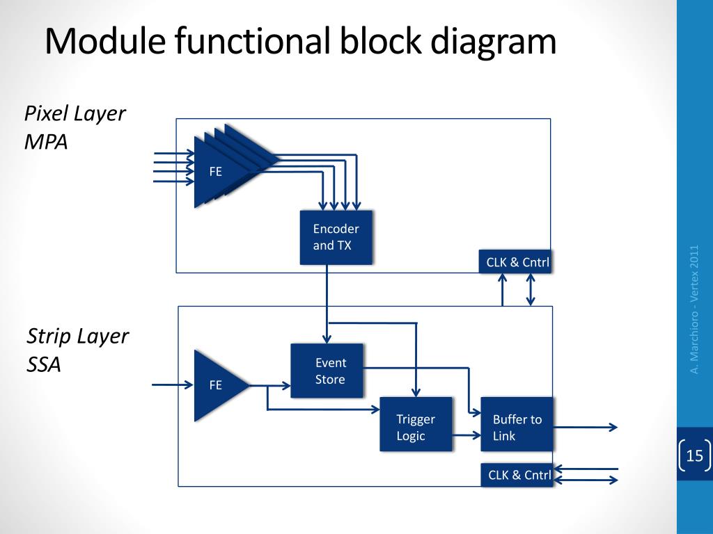 Module functional block diagram Pixel Layer MPA FE Encoder and TX CLK & Cntrl A. Marchioro - Vertex 2011 Strip Layer SSA Event Store FE Trigger Logic Buffer to Link CLK & Cntrl