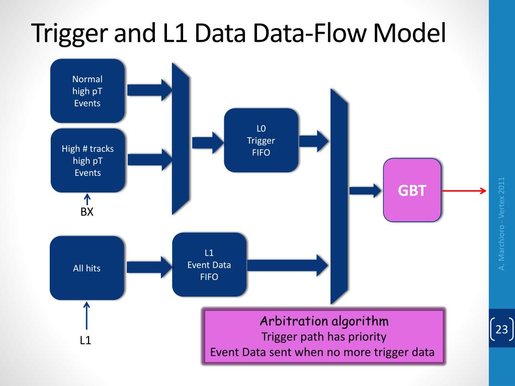 Trigger and L1 Data Data-Flow Model Normalhigh pT Events L0 Trigger FIFO High # tracks high pT Events GBT BX A. Marchioro - Vertex 2011 L1 Event Data FIFO All hits Arbitration algorithmTrigger path has priority Event Data sent when no more trigger data L1