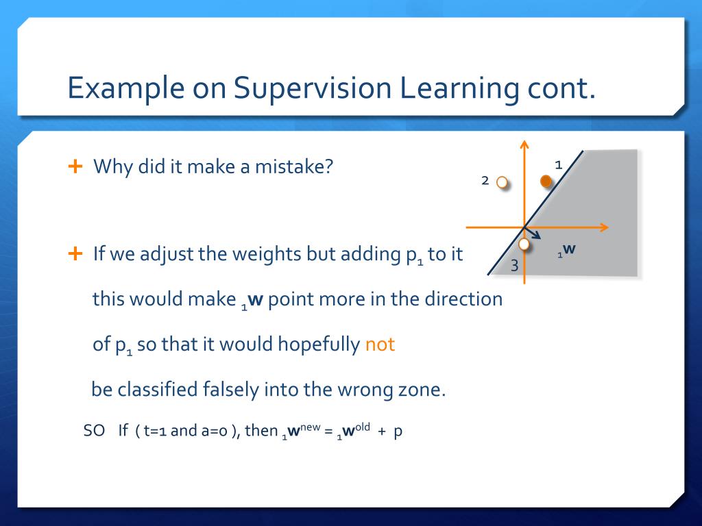 Example on Supervision Learning cont. • Why did it make a mistake? 1w • If we adjust the weights but adding p1 to it this would make 1w point more in the direction of p1 so that it would hopefully not be classified falsely into the wrong zone. 1 2 SO If ( t=1 and a=0 ), then 1wnew = 1wold + p 3