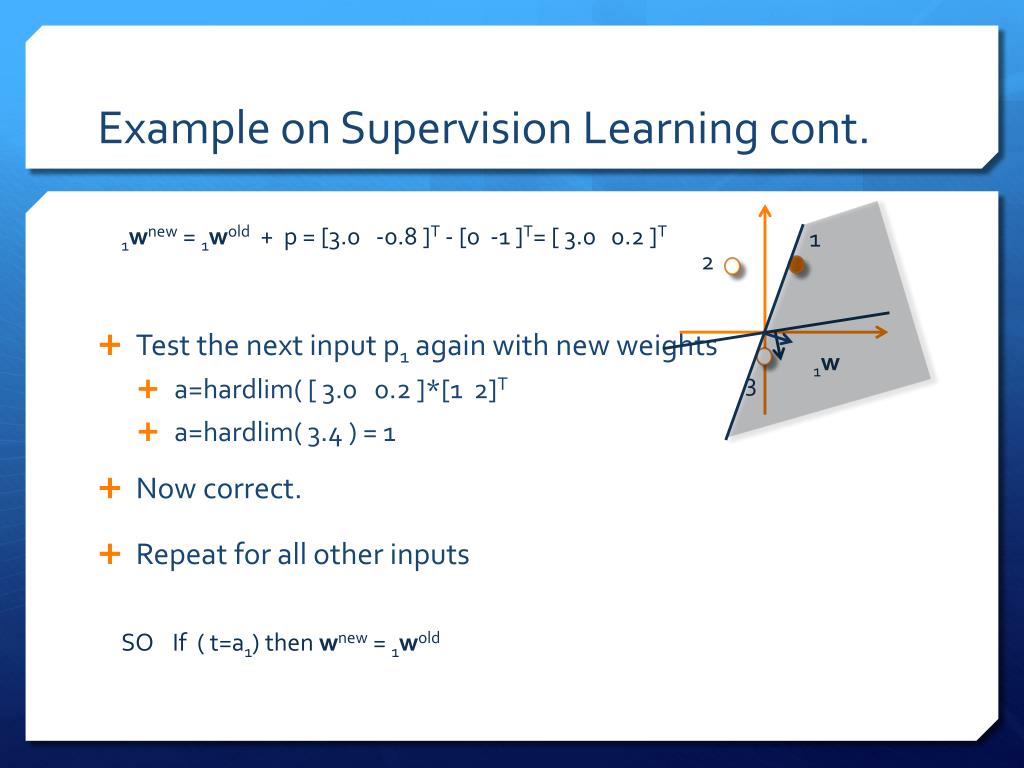 Example on Supervision Learning cont. 1wnew = 1wold + p = [3.0 -0.8 ]T - [0 -1 ]T= [ 3.0 0.2 ]T • Test the next input p1 again with new weights • a=hardlim( [ 3.0 0.2 ]*[1 2]T • a=hardlim( 3.4 ) = 1 1w • Now correct. • Repeat for all other inputs 1 2 SO If ( t=a1) then wnew = 1wold 3