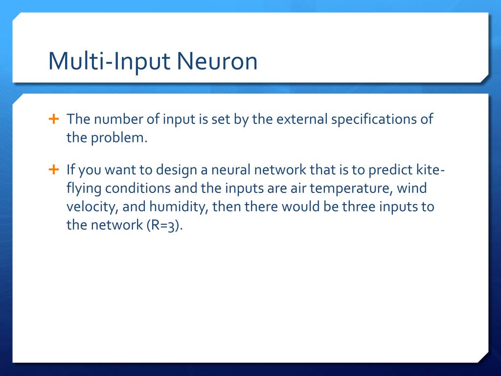 Multi-Input Neuron • The number of input is set by the external specifications of the problem. • If you want to design a neural network that is to predict kite-flying conditions and the inputs are air temperature, wind velocity, and humidity, then there would be three inputs to the network (R=3).