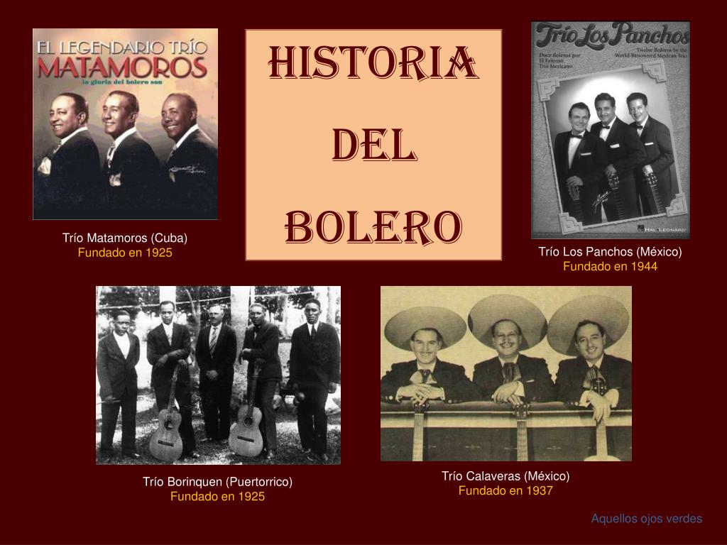 Historia del BOLERO. Trío Matamoros (Cuba) Fundado en 1925. Trío Los Panchos (México) Fundado en 1944. Trío Calaveras (México) Fundado en 1937. Trío Borinquen (Puertorrico) Fundado en 1925. Aquellos ojos verdes. Historia del Bolero 1ª parte De fines del siglo XIX hasta 1940.