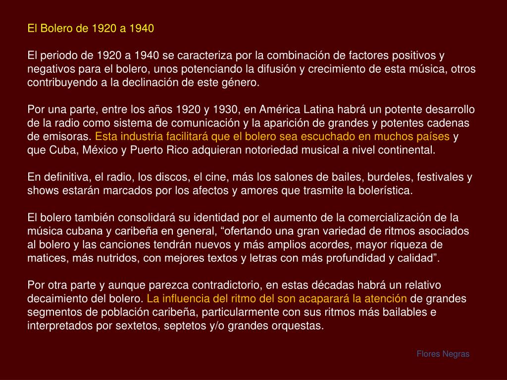 El Bolero de 1920 a 1940 El periodo de 1920 a 1940 se caracteriza por la combinación de factores positivos y negativos para el bolero, unos potenciando la difusión y crecimiento de esta música, otros contribuyendo a la declinación de este género. Por una parte, entre los años 1920 y 1930, en América Latina habrá un potente desarrollo de la radio como sistema de comunicación y la aparición de grandes y potentes cadenas de emisoras. Esta industria facilitará que el bolero sea escuchado en muchos países y que Cuba, México y Puerto Rico adquieran notoriedad musical a nivel continental. En definitiva, el radio, los discos, el cine, más los salones de bailes, burdeles, festivales y shows estarán marcados por los afectos y amores que trasmite la bolerística. El bolero también consolidará su identidad por el aumento de la comercialización de la música cubana y caribeña en general, “ofertando una gran variedad de ritmos asociados al bolero y las canciones tendrán nuevos y más amplios acordes, mayor riqueza de matices, más nutridos, con mejores textos y letras con más profundidad y calidad”. Por otra parte y aunque parezca contradictorio, en estas décadas habrá un relativo decaimiento del bolero. La influencia del ritmo del son acaparará la atención de grandes segmentos de población caribeña, particularmente con sus ritmos más bailables e interpretados por sextetos, septetos y/o grandes orquestas. Flores Negras