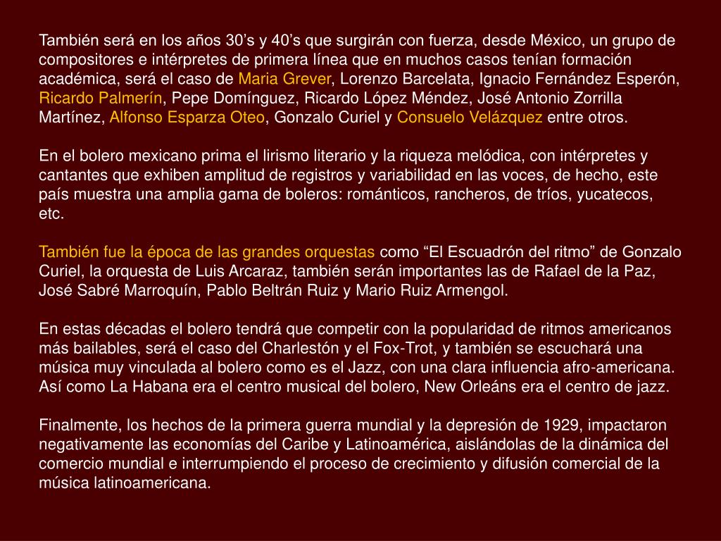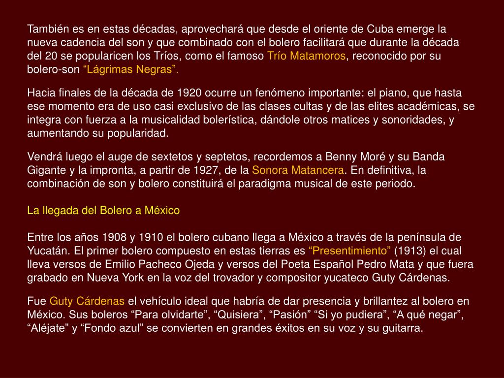 También es en estas décadas, aprovechará que desde el oriente de Cuba emerge la nueva cadencia del son y que combinado con el bolero facilitará que durante la década del 20 se popularicen los Tríos, como el famoso Trío Matamoros, reconocido por su bolero-son “Lágrimas Negras”. Hacia finales de la década de 1920 ocurre un fenómeno importante: el piano, que hasta ese momento era de uso casi exclusivo de las clases cultas y de las elites académicas, se integra con fuerza a la musicalidad bolerística, dándole otros matices y sonoridades, y aumentando su popularidad. Vendrá luego el auge de sextetos y septetos, recordemos a Benny Moré y su Banda Gigante y la impronta, a partir de 1927, de la Sonora Matancera. En definitiva, la combinación de son y bolero constituirá el paradigma musical de este periodo. La llegada del Bolero a México Entre los años 1908 y 1910 el bolero cubano llega a México a través de la península de Yucatán. El primer bolero compuesto en estas tierras es “Presentimiento” (1913) el cual lleva versos de Emilio Pacheco Ojeda y versos del Poeta Español Pedro Mata y que fuera grabado en Nueva York en la voz del trovador y compositor yucateco Guty Cárdenas. Fue Guty Cárdenas el vehículo ideal que habría de dar presencia y brillantez al bolero en México. Sus boleros “Para olvidarte”, “Quisiera”, “Pasión” “Si yo pudiera”, “A qué negar”, “Aléjate” y “Fondo azul” se convierten en grandes éxitos en su voz y su guitarra.