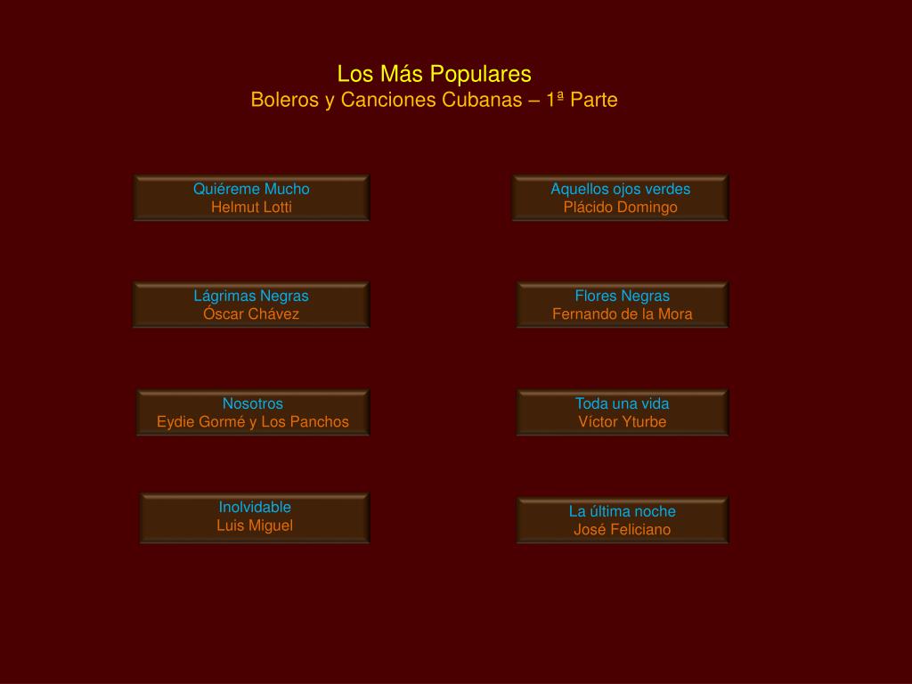 Los Más Populares Boleros y Canciones Cubanas – 1ª Parte Quiéreme Mucho Helmut Lotti Aquellos ojos verdes Plácido Domingo Lágrimas Negras Óscar Chávez Flores Negras Fernando de la Mora Nosotros Eydie Gormé y Los Panchos Toda una vida Víctor Yturbe Inolvidable Luis Miguel La última noche José Feliciano
