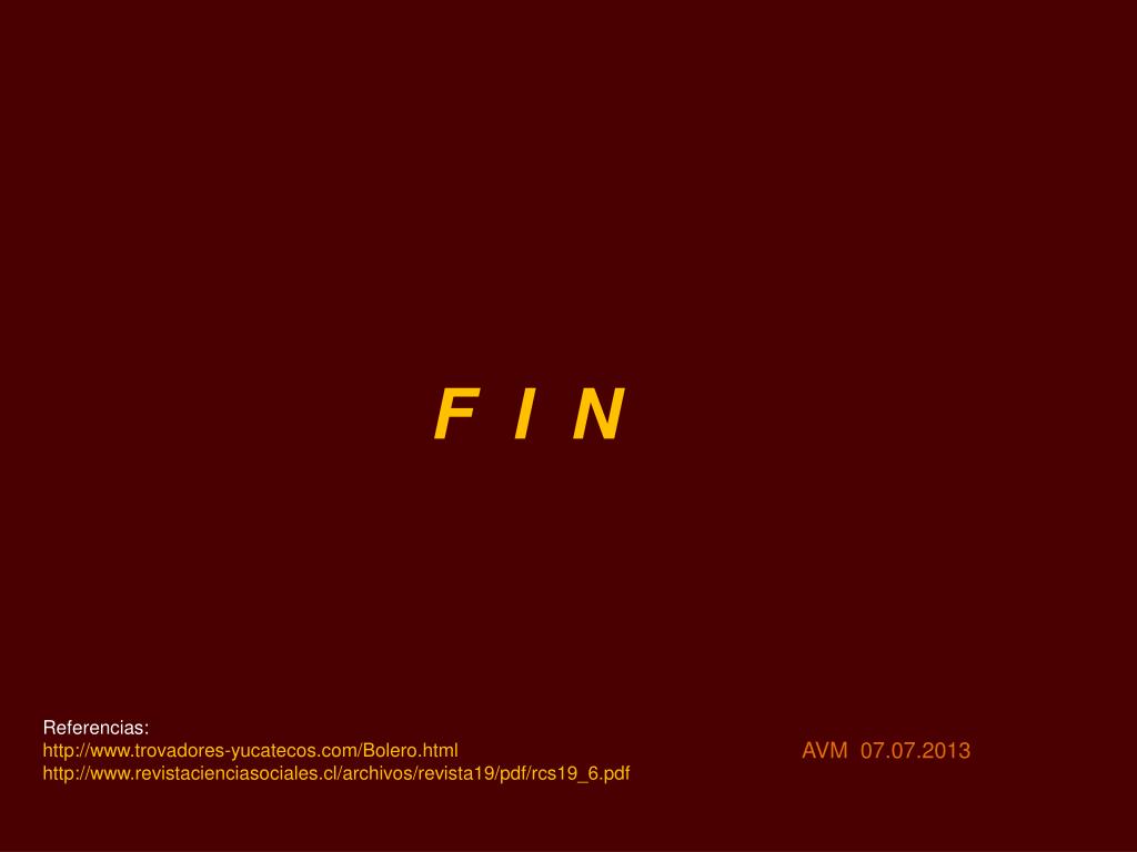 F I N Referencias: http://www.trovadores-yucatecos.com/Bolero.html http://www.revistacienciasociales.cl/archivos/revista19/pdf/rcs19_6.pdf AVM 07.07.2013
