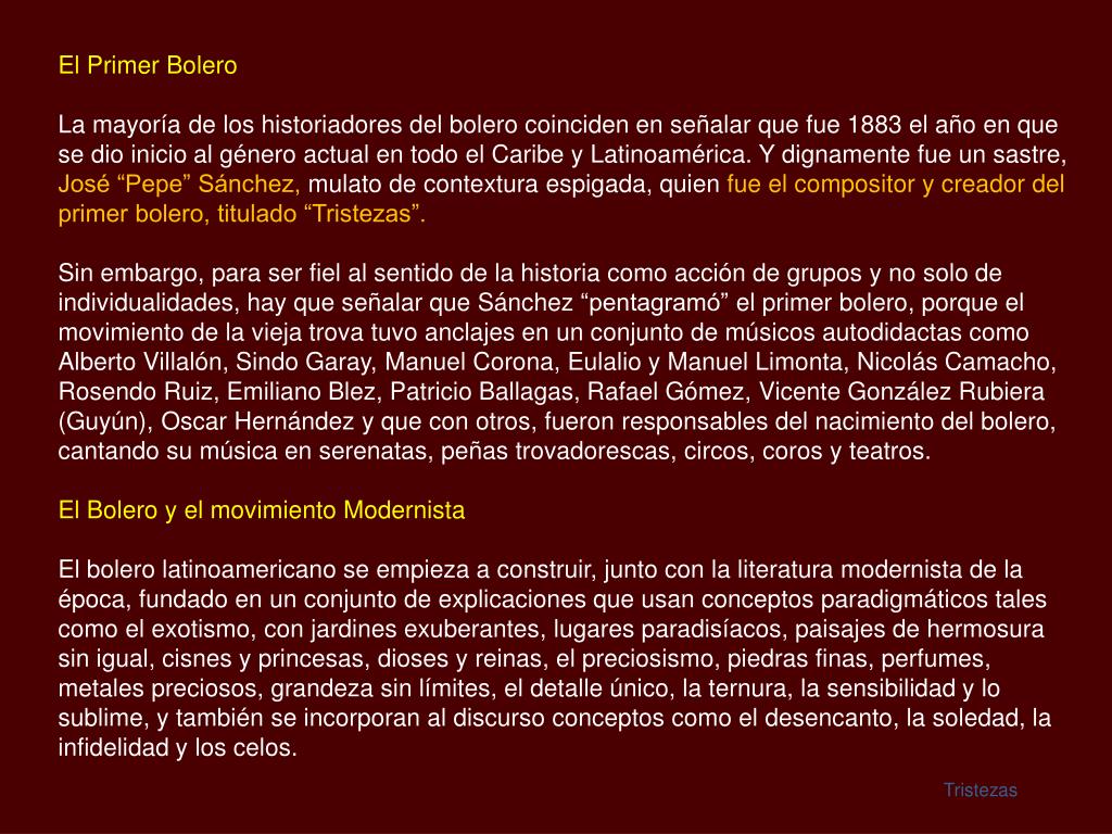 El Primer Bolero La mayoría de los historiadores del bolero coinciden en señalar que fue 1883 el año en que se dio inicio al género actual en todo el Caribe y Latinoamérica. Y dignamente fue un sastre, José “Pepe” Sánchez, mulato de contextura espigada, quien fue el compositor y creador del primer bolero, titulado “Tristezas”. Sin embargo, para ser fiel al sentido de la historia como acción de grupos y no solo de individualidades, hay que señalar que Sánchez “pentagramó” el primer bolero, porque el movimiento de la vieja trova tuvo anclajes en un conjunto de músicos autodidactas como Alberto Villalón, Sindo Garay, Manuel Corona, Eulalio y Manuel Limonta, Nicolás Camacho, Rosendo Ruiz, Emiliano Blez, Patricio Ballagas, Rafael Gómez, Vicente González Rubiera (Guyún), Oscar Hernández y que con otros, fueron responsables del nacimiento del bolero, cantando su música en serenatas, peñas trovadorescas, circos, coros y teatros. El Bolero y el movimiento Modernista El bolero latinoamericano se empieza a construir, junto con la literatura modernista de la época, fundado en un conjunto de explicaciones que usan conceptos paradigmáticos tales como el exotismo, con jardines exuberantes, lugares paradisíacos, paisajes de hermosura sin igual, cisnes y princesas, dioses y reinas, el preciosismo, piedras finas, perfumes, metales preciosos, grandeza sin límites, el detalle único, la ternura, la sensibilidad y lo sublime, y también se incorporan al discurso conceptos como el desencanto, la soledad, la infidelidad y los celos. Tristezas
