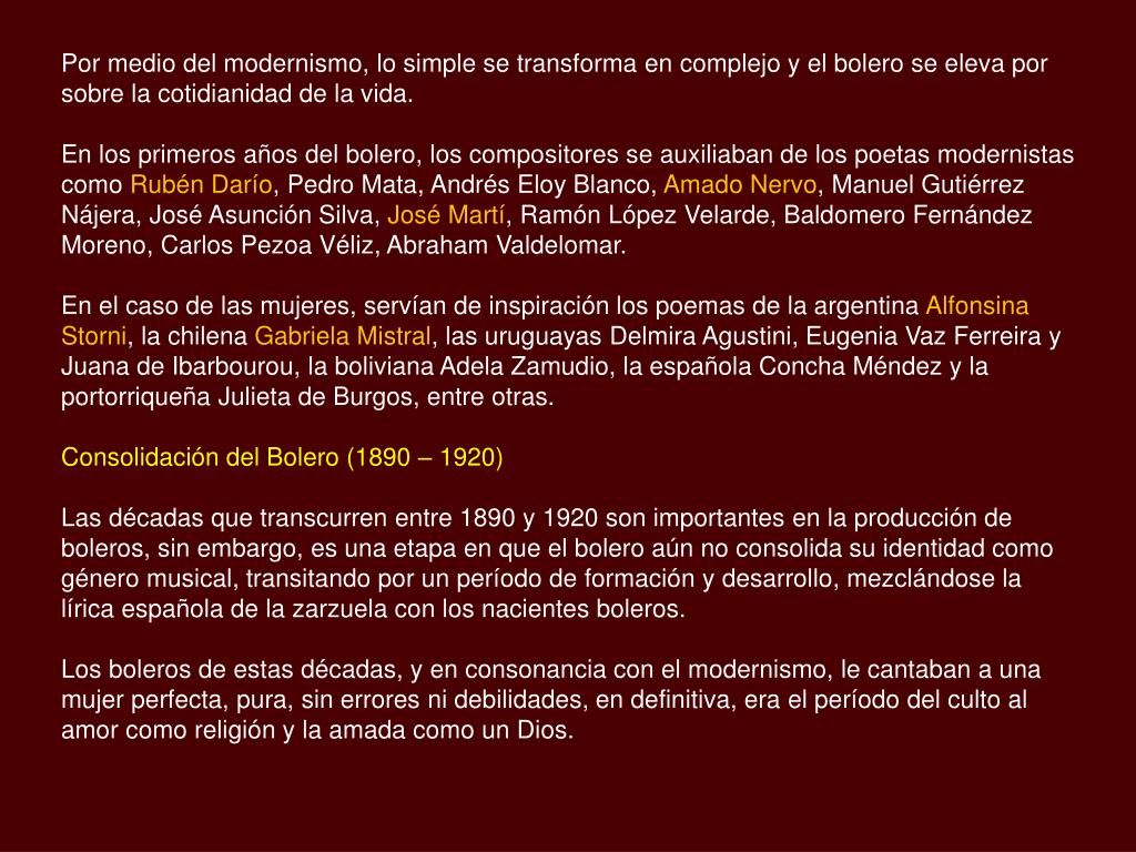 Por medio del modernismo, lo simple se transforma en complejo y el bolero se eleva por sobre la cotidianidad de la vida. En los primeros años del bolero, los compositores se auxiliaban de los poetas modernistas como Rubén Darío, Pedro Mata, Andrés Eloy Blanco, Amado Nervo, Manuel Gutiérrez Nájera, José Asunción Silva, José Martí, Ramón López Velarde, Baldomero Fernández Moreno, Carlos Pezoa Véliz, Abraham Valdelomar. En el caso de las mujeres, servían de inspiración los poemas de la argentina Alfonsina Storni, la chilena Gabriela Mistral, las uruguayas Delmira Agustini, Eugenia Vaz Ferreira y Juana de Ibarbourou, la boliviana Adela Zamudio, la española Concha Méndez y la portorriqueña Julieta de Burgos, entre otras. Consolidación del Bolero (1890 – 1920) Las décadas que transcurren entre 1890 y 1920 son importantes en la producción de boleros, sin embargo, es una etapa en que el bolero aún no consolida su identidad como género musical, transitando por un período de formación y desarrollo, mezclándose la lírica española de la zarzuela con los nacientes boleros. Los boleros de estas décadas, y en consonancia con el modernismo, le cantaban a una mujer perfecta, pura, sin errores ni debilidades, en definitiva, era el período del culto al amor como religión y la amada como un Dios.