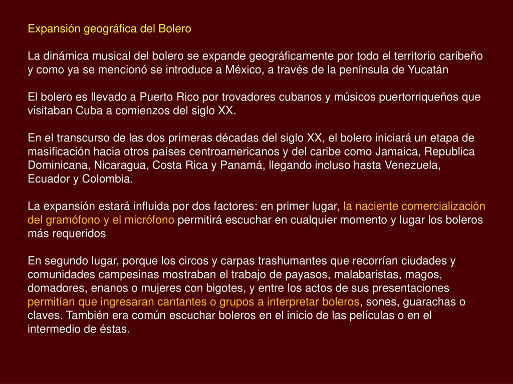 Expansión geográfica del Bolero La dinámica musical del bolero se expande geográficamente por todo el territorio caribeño y como ya se mencionó se introduce a México, a través de la península de Yucatán El bolero es llevado a Puerto Rico por trovadores cubanos y músicos puertorriqueños que visitaban Cuba a comienzos del siglo XX. En el transcurso de las dos primeras décadas del siglo XX, el bolero iniciará un etapa de masificación hacia otros países centroamericanos y del caribe como Jamaica, Republica Dominicana, Nicaragua, Costa Rica y Panamá, llegando incluso hasta Venezuela, Ecuador y Colombia. La expansión estará influida por dos factores: en primer lugar, la naciente comercialización del gramófono y el micrófono permitirá escuchar en cualquier momento y lugar los boleros más requeridos En segundo lugar, porque los circos y carpas trashumantes que recorrían ciudades y comunidades campesinas mostraban el trabajo de payasos, malabaristas, magos, domadores, enanos o mujeres con bigotes, y entre los actos de sus presentaciones permitían que ingresaran cantantes o grupos a interpretar boleros, sones, guarachas o claves. También era común escuchar boleros en el inicio de las películas o en el intermedio de éstas.