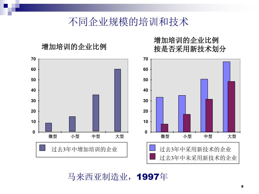 不同企业规模的培训和技术 增加培训的企业比例 按是否采用新技术划分 增加培训的企业比例 70 70 60 60 50 50 40 40 30 30 20 20 10 10 0 0 微型 小型 中型 大型 微型 小型 中型 大型 过去3年中增加培训的企业 过去3年中采用新技术的企业 过去3年中未采用新技术的企业 马来西亚制造业,1997年