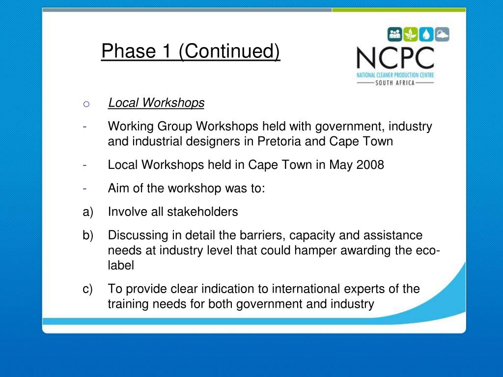 Local Workshops Working Group Workshops held with government, industry and industrial designers in Pretoria and Cape Town Local Workshops held in Cape Town in May 2008 Aim of the workshop was to: Involve all stakeholders Discussing in detail the barriers, capacity and assistance needs at industry level that could hamper awarding the eco-label To provide clear indication to international experts of the training needs for both government and industry Phase 1 (Continued)