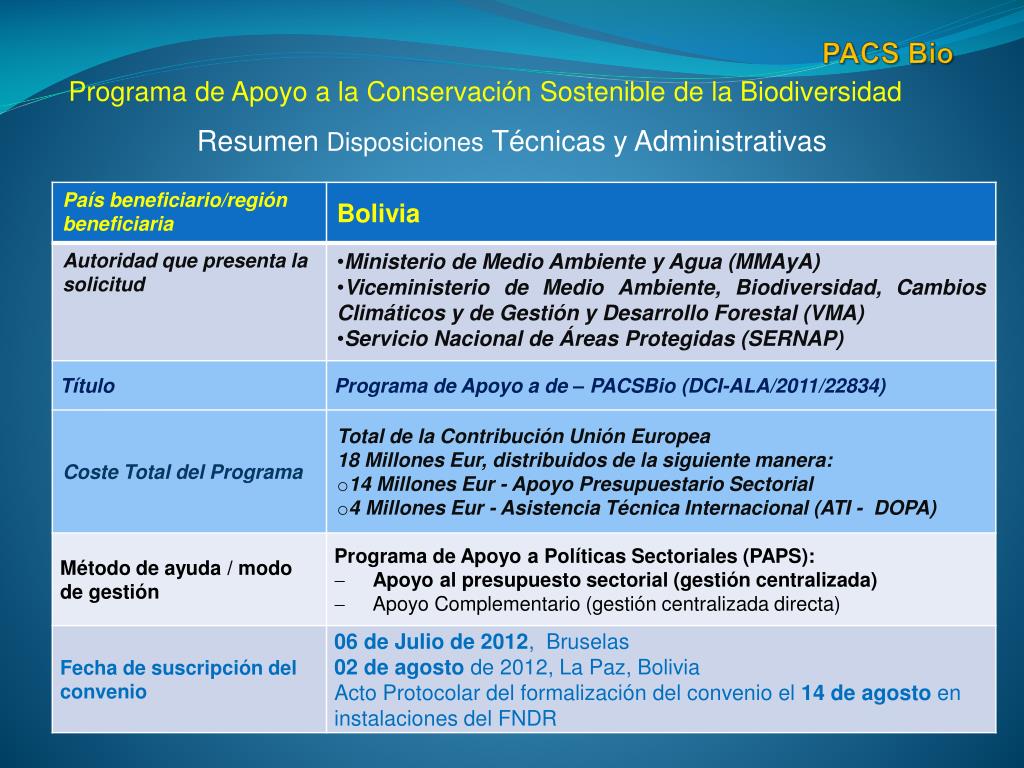 La Unión Europea (UE) en el marco de su política comunitaria de cooperación favorece al desarrollo económico y social sostenible, para la consecución de los Objetivos de Desarrollo del Milenio (ODMs) PACS Bio Bolivia tiene una gran riqueza natural y una amplia diversidad biológica; cuenta con un Sistema Nacional de Áreas Protegidas (SNAP), que articula la conservación y el desarrollo sostenible y totaliza un 22% del territorio nacional que está bajo el concepto de Área Protegida Antecedentes “Estudio Sectorial - El Rol de las Áreas Protegidas para la Protección del Medio Ambiente y el Desarrollo Sustentable” el mismo fue elaborado por la Delegación de la Unión Europea (enero de 2010), y se visualiza que la UE no ha tenido una participación directa en este proceso, pese a haber trabajado en ámbitos complementarios como cuencas y medio ambiente.