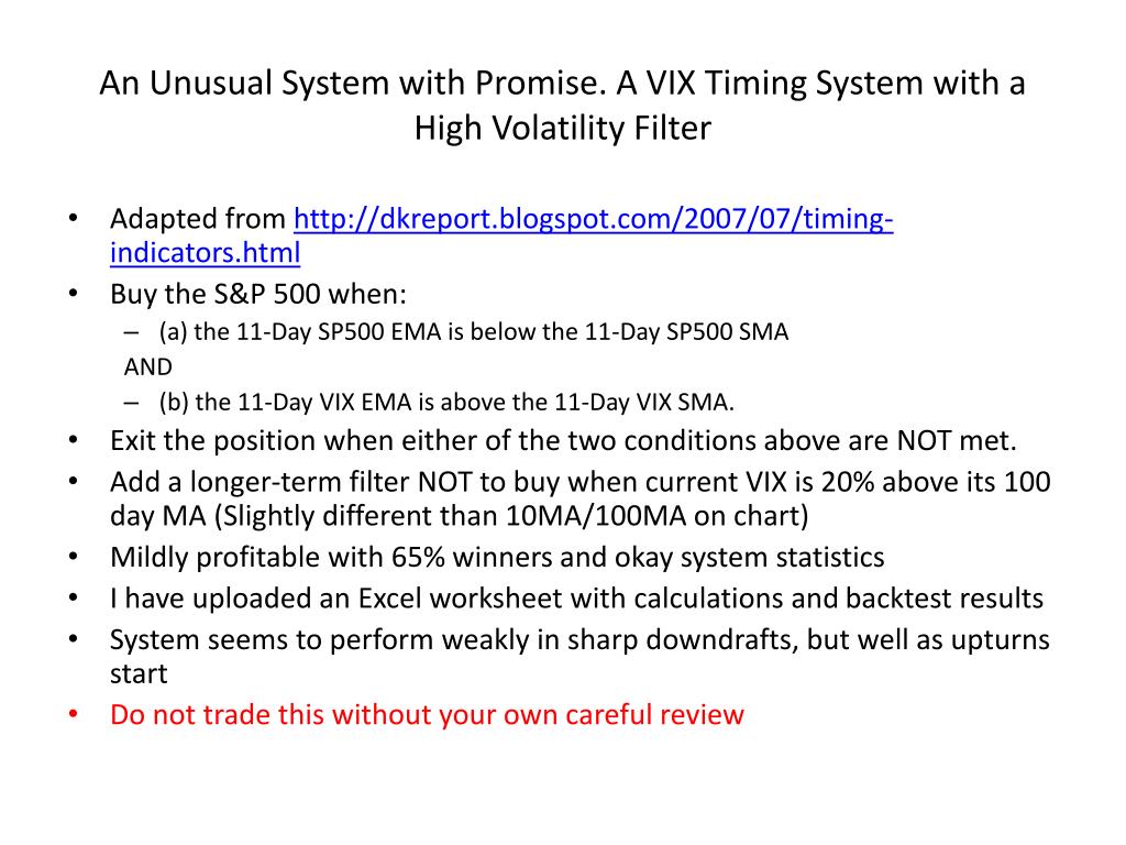 An Unusual System with Promise. A VIX Timing System with a High Volatility Filter • Adapted from http://dkreport.blogspot.com/2007/07/timing-indicators.html • Buy the S&P 500 when: • (a) the 11-Day SP500 EMA is below the 11-Day SP500 SMA AND • (b) the 11-Day VIX EMA is above the 11-Day VIX SMA. • Exit the position when either of the two conditions above are NOT met. • Add a longer-term filter NOT to buy when current VIX is 20% above its 100 day MA (Slightly different than 10MA/100MA on chart) • Mildly profitable with 65% winners and okay system statistics • I have uploaded an Excel worksheet with calculations and backtest results • System seems to perform weakly in sharp downdrafts, but well as upturns start • Do not trade this without your own careful review