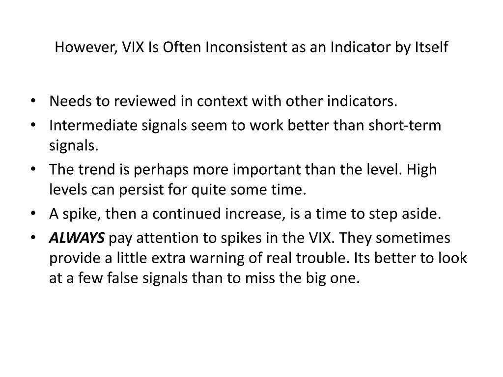 However, VIX Is Often Inconsistent as an Indicator by Itself • Needs to reviewed in context with other indicators. • Intermediate signals seem to work better than short-term signals. • The trend is perhaps more important than the level. High levels can persist for quite some time. • A spike, then a continued increase, is a time to step aside. • ALWAYS pay attention to spikes in the VIX. They sometimes provide a little extra warning of real trouble. Its better to look at a few false signals than to miss the big one.