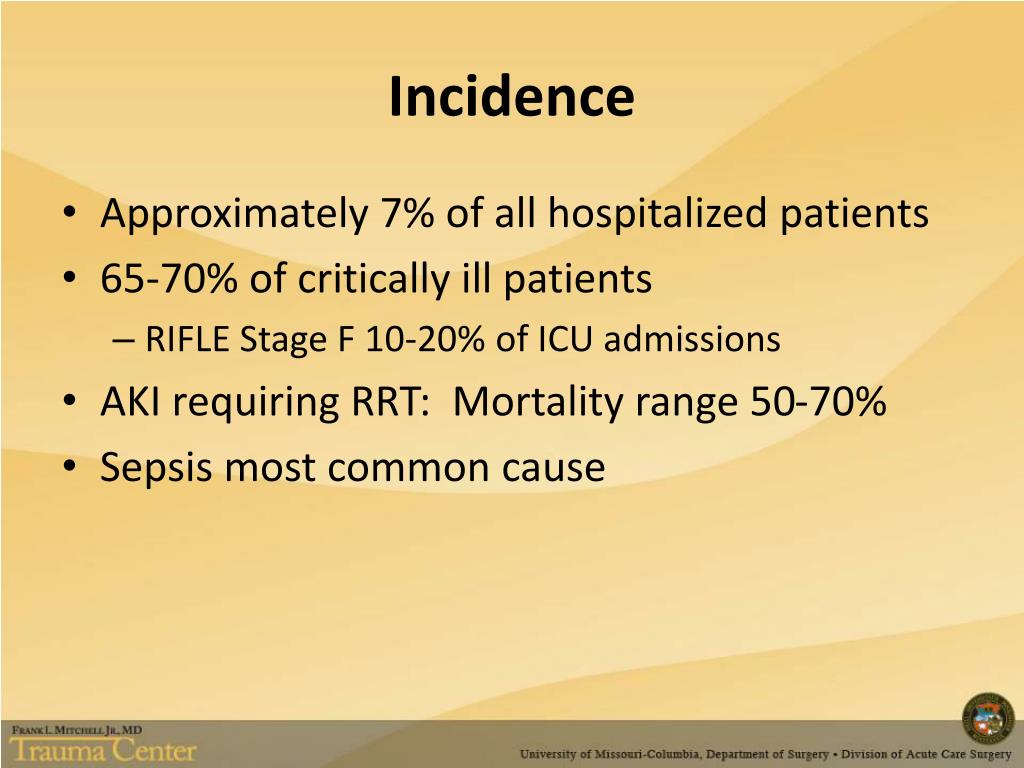 Incidence • Approximately 7% of all hospitalized patients • 65-70% of critically ill patients • RIFLE Stage F 10-20% of ICU admissions • AKI requiring RRT: Mortality range 50-70% • Sepsis most common cause