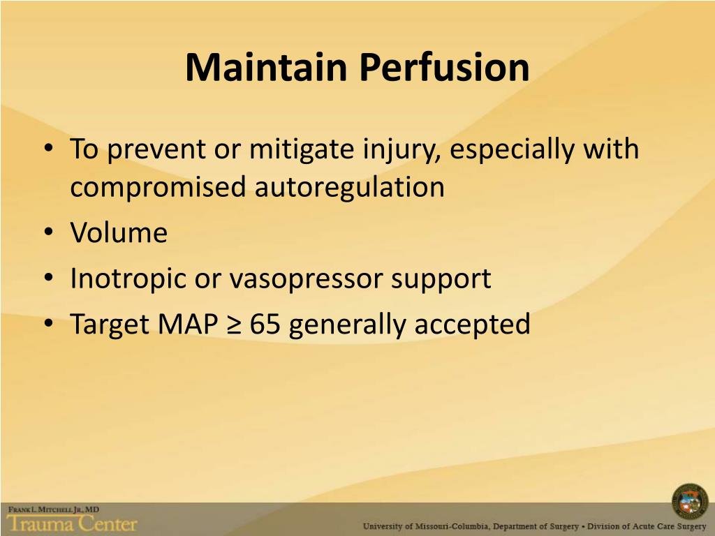 Maintain Perfusion • To prevent or mitigate injury, especially with compromised autoregulation • Volume • Inotropic or vasopressor support • Target MAP ≥ 65 generally accepted