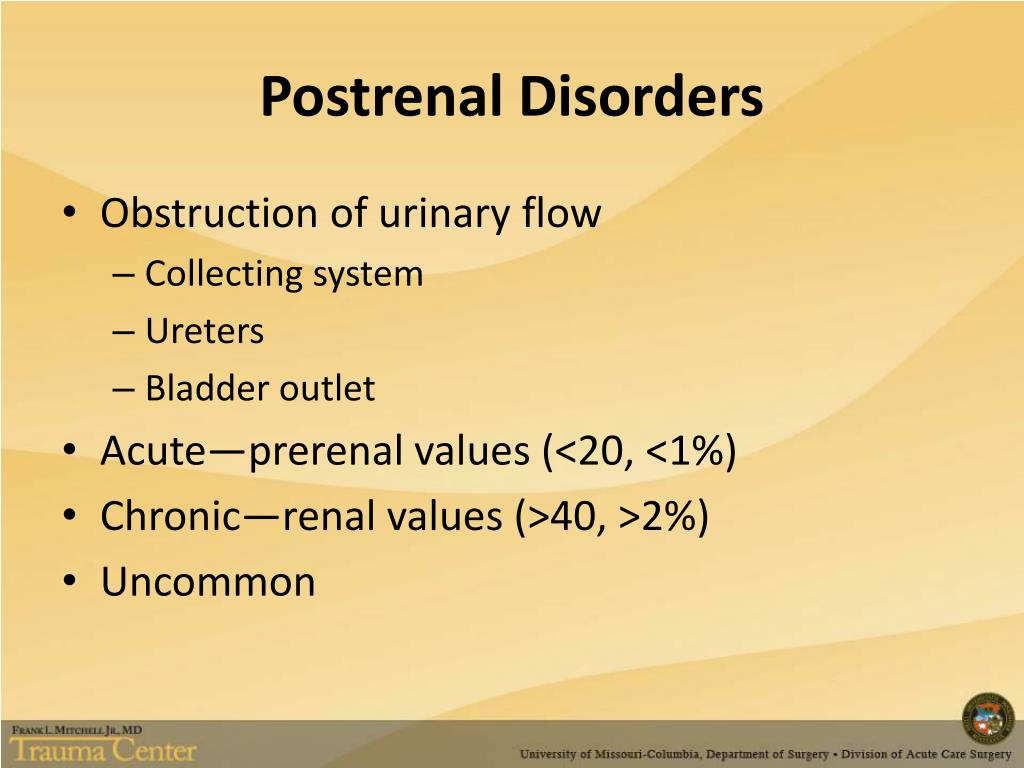 Postrenal Disorders • Obstruction of urinary flow • Collecting system • Ureters • Bladder outlet • Acute—prerenal values (<20, <1%) • Chronic—renal values (>40, >2%) • Uncommon