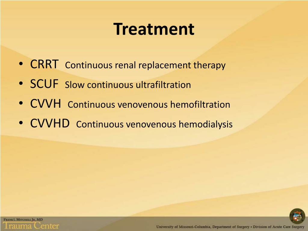 Treatment • CRRT Continuous renal replacement therapy • SCUF Slow continuous ultrafiltration • CVVH Continuous venovenous hemofiltration • CVVHD Continuous venovenous hemodialysis