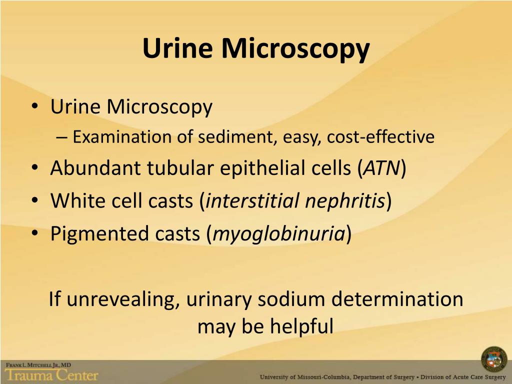 Urine Microscopy • Urine Microscopy • Examination of sediment, easy, cost-effective • Abundant tubular epithelial cells (ATN) • White cell casts (interstitial nephritis) • Pigmented casts (myoglobinuria) If unrevealing, urinary sodium determination may be helpful