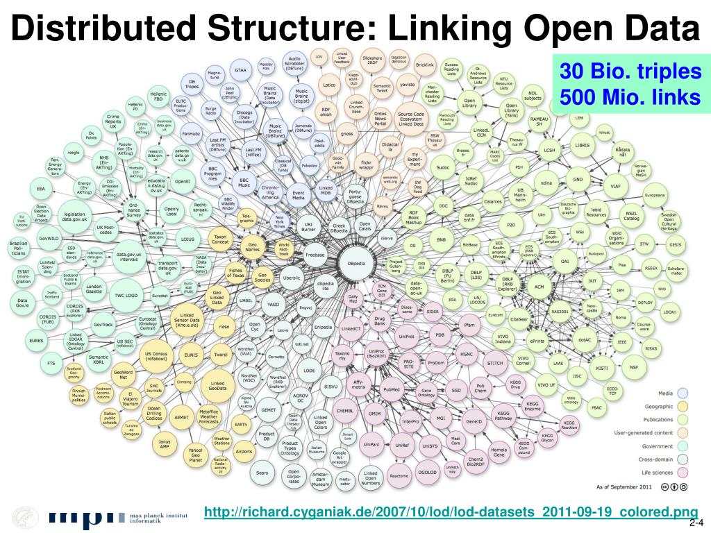 Distributed Structure: Linking Open Data 30 Bio. triples 500 Mio. links http://richard.cyganiak.de/2007/10/lod/lod-datasets_2011-09-19_colored.png