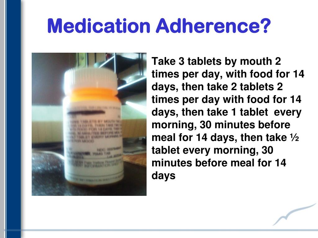 Medication Adherence? Take 3 tablets by mouth 2 times per day, with food for 14 days, then take 2 tablets 2 times per day with food for 14 days, then take 1 tablet every morning, 30 minutes before meal for 14 days, then take ½ tablet every morning, 30 minutes before meal for 14 days