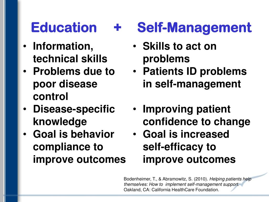 Education + Self-Management Skills to act on problems Patients ID problems in self-management Improving patient confidence to change Goal is increased self-efficacy to improve outcomes • Information, technical skills • Problems due to poor disease control • Disease-specific knowledge • Goal is behavior compliance to improve outcomes Bodenheimer, T., & Abramowitz, S. (2010). Helping patients help themselves: How to implement self-management support. Oakland, CA: California HealthCare Foundation.
