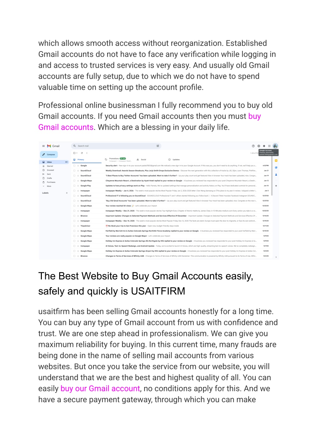 7. transactions very easily. And the accounts will be delivered to you very quickly after the order. So if you want to buy the best Gmail account from the best and most trusted website usaitfirm, then contact us now via email, Telegram or WhatsApp. Why should you purchase Gmail Account from usaitfirm? usaitfirm will provide you with high quality Gmail accounts. Our Gmail accounts are fully verified and accounts are created manually, due to which the chances of these accounts being dropped are very low. Also, you will get all types of Gmail accounts from us as per your needs. You can get one to thousands of Gmails from us. We deliver orders every day. You can order as many Gmails as you want every day and get the accounts delivered on the same day. You will also get bonuses for multiple orders and our accounts are very cheap and there are no fake bots in the accounts. As a professional online merchant, we Guarantee (promise) to provide you with 100% of the highest quality service. So, without further delay, contact us now to purchase Gmail account according to your needs and purchase Gmail accounts according to your needs. Conclusion Gmail Account remains one of the most reliable, secure, and widely used email platforms in the world. With its powerful features, seamless integration with Google services, strong security measures, and user-friendly interface, Gmail supports both personal and professional communication successfully.