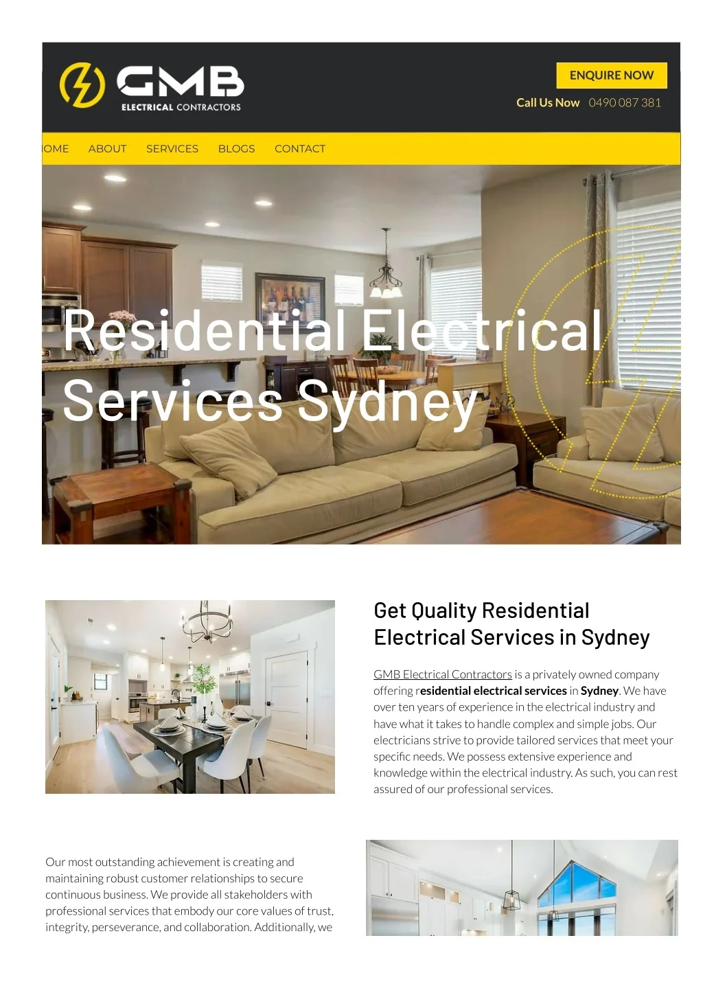 ENQUIRE NOW Call Us Now 0490 087 381 HOME ABOUT SERVICES BLOGS CONTACT Residential Electrical Services Sydney Get Quality Residential Electrical Services in Sydney GMB Electrical Contractors is a privately owned company offering residential electrical services in Sydney. We have over ten years of experience in the electrical industry and have what it takes to handle complex and simple jobs. Our electricians strive to provide tailored services that meet your speci?c needs. We possess extensive experience and knowledge within the electrical industry. As such, you can rest assured of our professional services. Our most outstanding achievement is creating and maintaining robust customer relationships to secure continuous business. We provide all stakeholders with professional services that embody our core values of trust, integrity, perseverance, and collaboration. Additionally, we