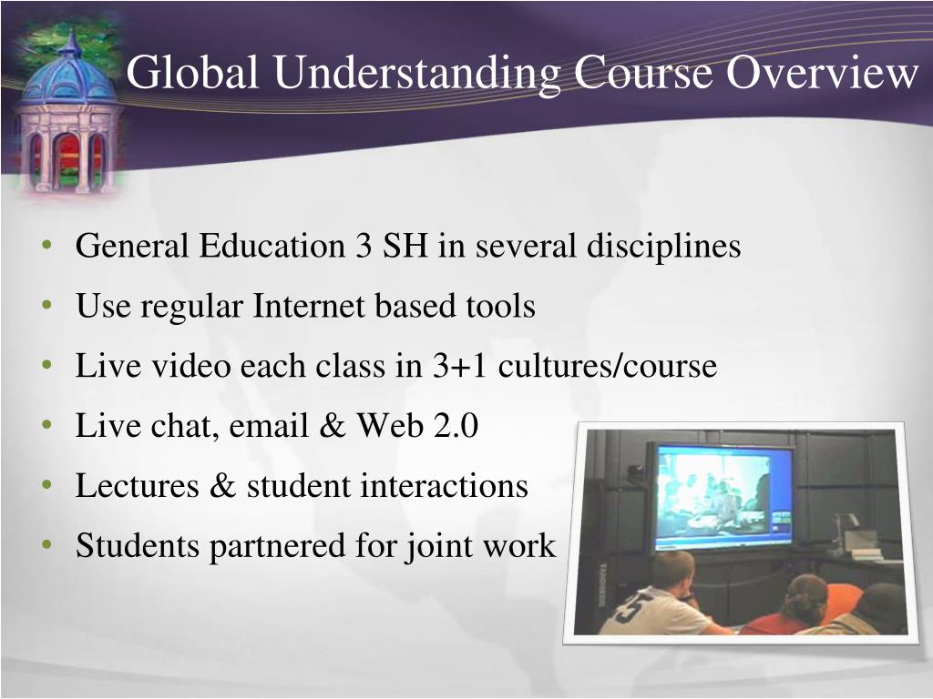 General Education 3 SH in several disciplines Use regular Internet based tools Live video each class in 3+1 cultures/course Live chat, email & Web 2.0 Lectures & student interactions Students partnered for joint work Global Understanding Course Overview