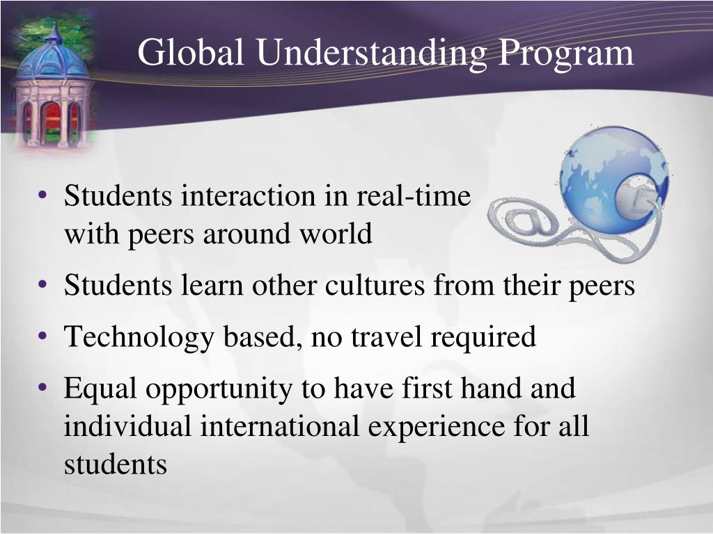 Global Understanding Program • Students interaction in real-time with peers around world • Students learn other cultures from their peers • Technology based, no travel required • Equal opportunity to have first hand and individualinternational experience for all students