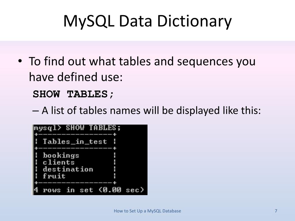 MySQL Data Dictionary • To find out what tables and sequences you have defined use: SHOW TABLES; • A list of tables names will be displayed like this: How to Set Up a MySQL Database
