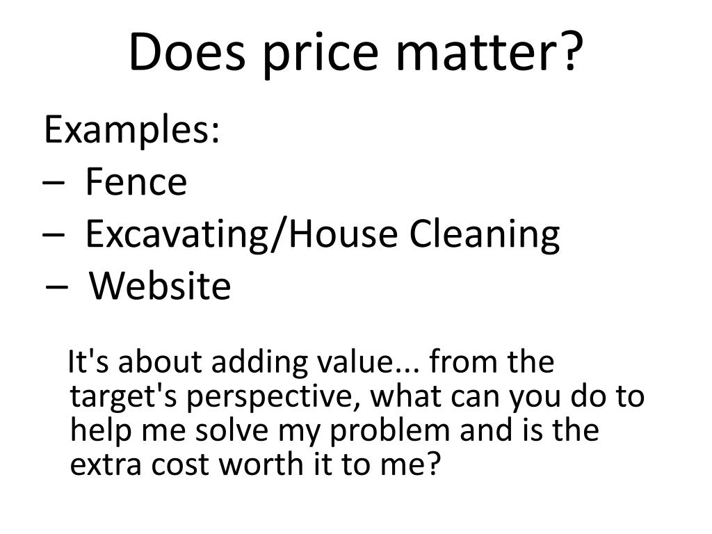 Does price matter? Examples: – Fence – Excavating/House Cleaning – Website It's about adding value... from the target's perspective, what can you do to help me solve my problem and is the extra cost worth it to me?