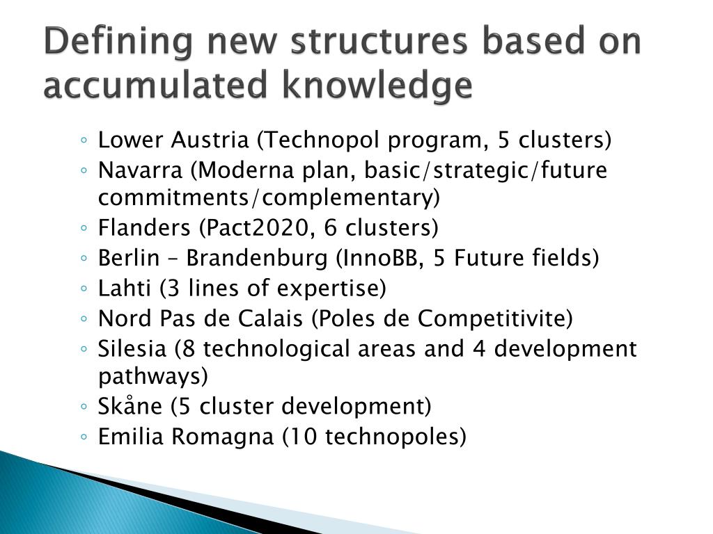 Defining new structures based on accumulated knowledge • Lower Austria (Technopol program, 5 clusters) • Navarra (Moderna plan, basic/strategic/future commitments/complementary) • Flanders (Pact2020, 6 clusters) • Berlin – Brandenburg (InnoBB, 5 Future fields) • Lahti (3 lines of expertise) • Nord Pas de Calais (Poles de Competitivite) • Silesia (8 technological areas and 4 development pathways) • Skåne (5 cluster development) • Emilia Romagna (10 technopoles)