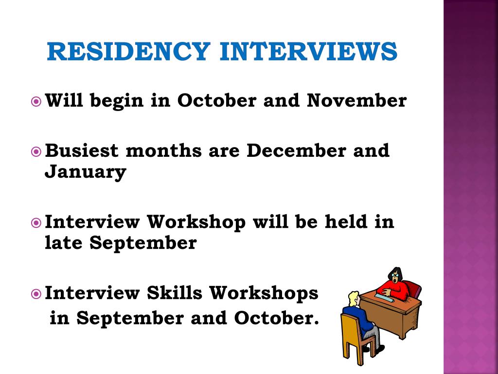 Residency Interviews • Will begin in October and November • Busiest months are December and January • Interview Workshop will be held in late September • Interview Skills Workshops in September and October.