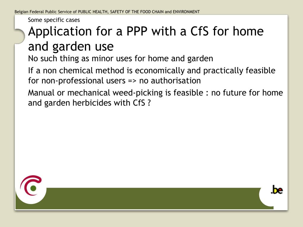 Somespecific cases Application for a PPP with a CfSfor home and garden use • No suchthing as minor usesfor home and garden • If a non chemicalmethodis economicallyandpracticallyfeasiblefor non-professional users => no authorisation • Manual or mechanical weed-picking is feasible : no futurefor home and garden herbicideswithCfS ?