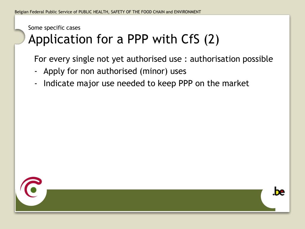 Somespecific cases Application for a PPP withCfS (2) • For every single notyetauthoriseduse: authorisationpossible • Applyfornon authorised(minor) uses • Indicate major useneededto keep PPP on the market